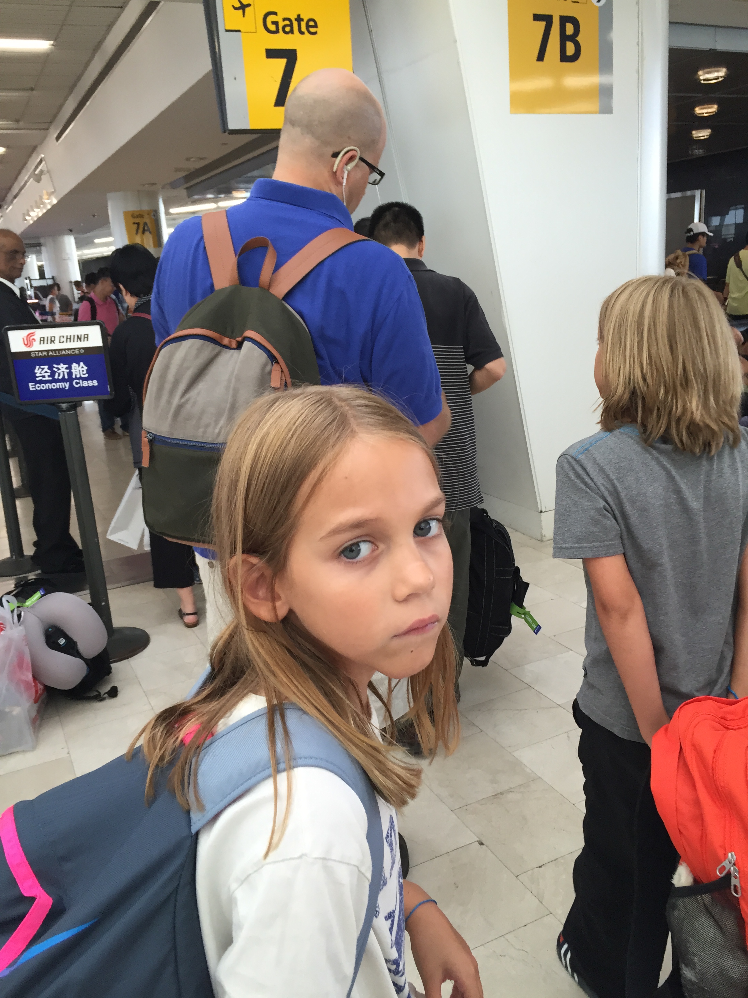 We made it to the Air China gate with about 15 minutes to spare before boarding. If you know us at all, we were not even stressed. Just a day in the life for the Bergeson’s. As the flight attendants began to allow passenger to board, they did not call seats or plane areas in order. It was a free for all. As I remember, this is also a precursor to much of our experiences waiting in line in China. The social rules are different for waiting on queue. We were last in line.
